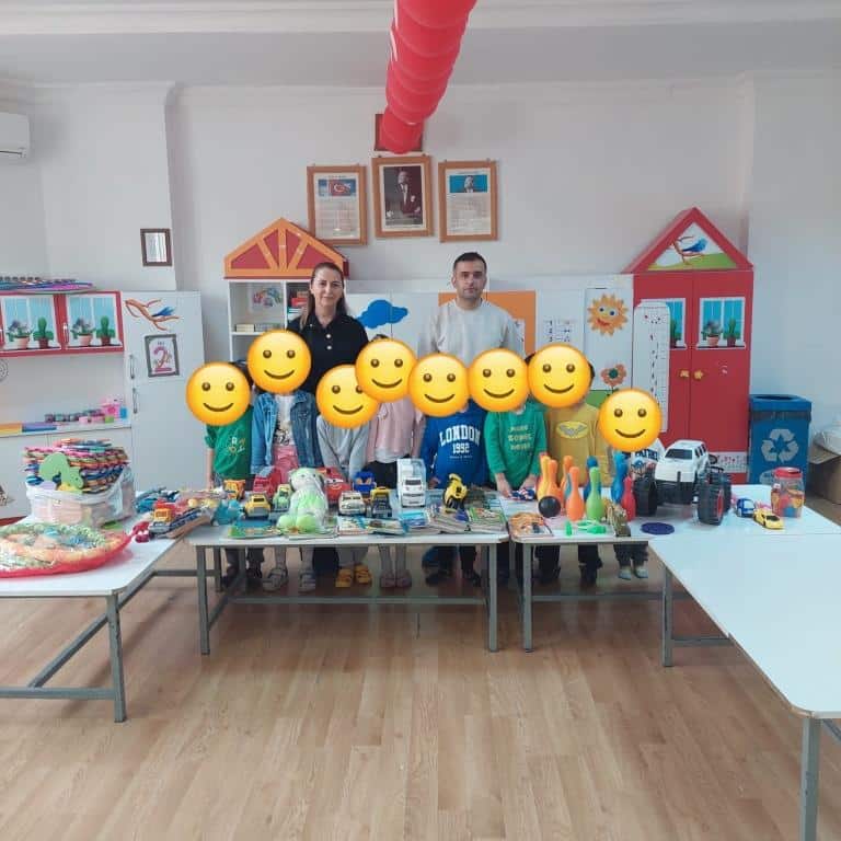 Small Steps , big awareness e twinning projemizin küçük vatandaşları; insanları seven çocuklar olarak Adıyamandaki depremzede çocuklarımızla Anasınıfı öğrencilerimiz oyuncaklarını paylaştılar.Gönül bağı kurdular.
